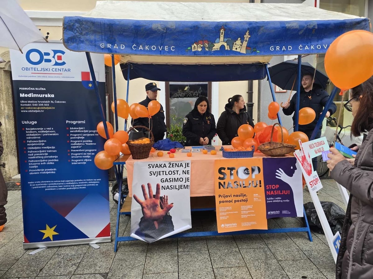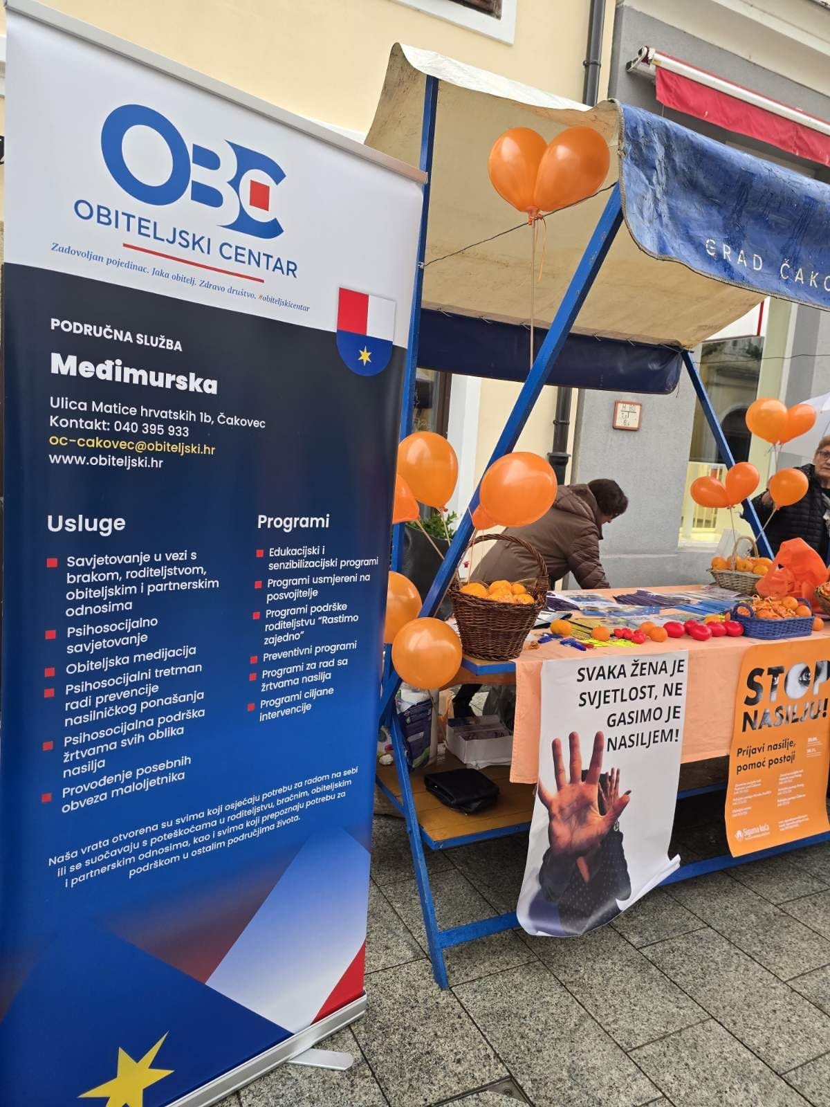 Povodom Međunarodnog dana borbe protiv nasilja nad ženama, 25. studenoga 2025. godine, stručne djelatnice Obiteljskog centra Područne službe Međimurska pridružile su se suradnji s partnerima – Inner Wheel klubom Čakovec, Domom za žrtve obiteljskog nasilja Sigurna kuća, Povjerenstvom za ravnopravnost spolova Grada Čakovca, Županijskim povjerenstvom za ravnopravnost spolova i Mobilnim preventivnim centrom policije – u provedbi informativno – edukativnih aktivnosti namijenjenih građanima.