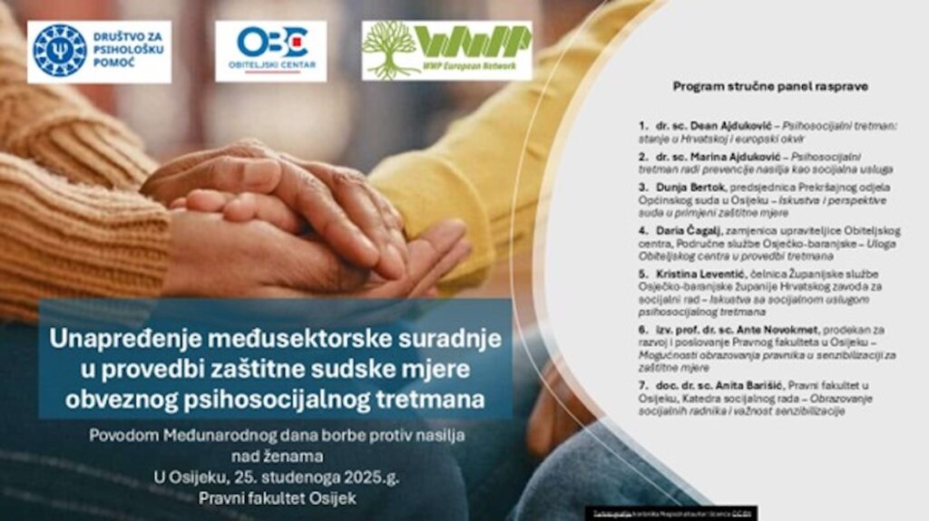 Povodom Međunarodnog dana borbe protiv nasilja nad ženama, 25. studenoga 2025. godine, održana je stručna panel rasprava „Unapređenje međusektorske suradnje u provedbi zaštitne sudske mjere obveznog psihosocijalnog tretmana počinitelja nasilja u obitelji“.