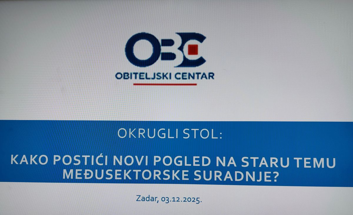 Povodom obilježavanja Međunarodnog dana borbe protiv nasilja nad ženama u Obiteljskom centru, Područnoj službi Zadarskoj dana 3. prosinca 2025. godine održan je okrugli stol na temu: „Kako postići novi pogled na staru temu međusektorske suradnje?“. Stručnjaci i članovi Županijskog tima za sprečavanje i borbu protiv nasilja nad ženama i nasilja u obitelji donijeli su konkretne mjere i korake za provedbu u 2026. godini s ciljem unaprjeđenja međusektorske suradnje u prevenciji nasilja i pružanju podrške žrtvama nasilja.