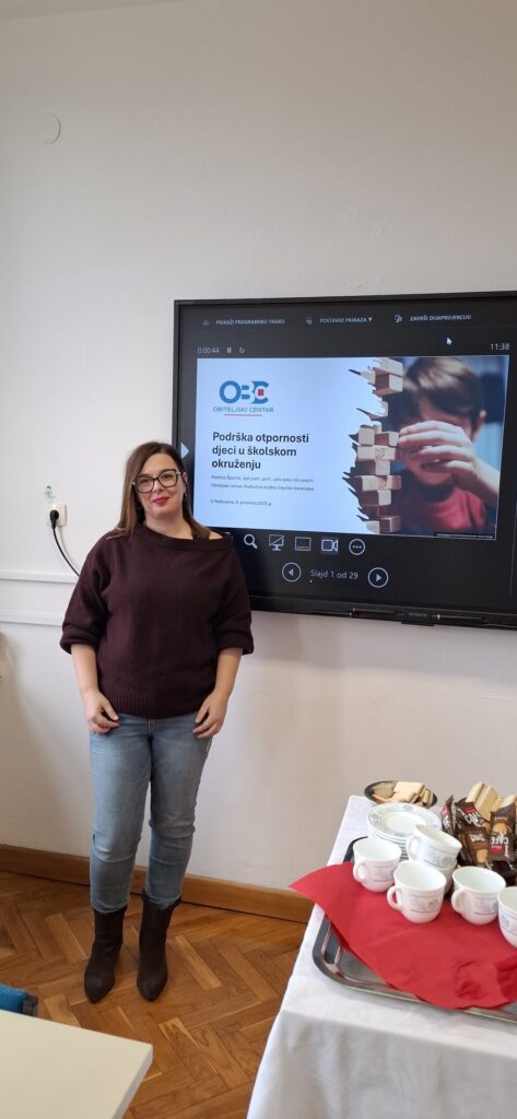 Na Županijskom stručnom vijeću stručnih suradnika pedagoga osnovnih škola Osječko–baranjske županije, održanom 5. prosinca 2025. godine u Osnovnoj školi Dore Pejačević u Našicama, stručna radnica – psihologinja Martina Špaček održala je predavanje na temu „Podrška otpornosti djeci u školskom okruženju“.