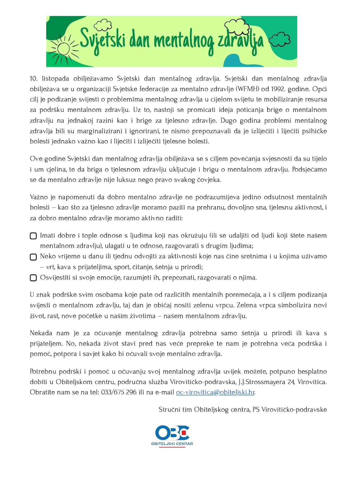 Na inicijativu Obiteljskog centra, Područne službe Virovitičko-podravske obilježio se Svjetski dan mentalnog zdravlja nizom aktivnosti. Kroz suradnju s medijima objavljeno je pismo stručnih radnica Obiteljskog centra u kojem se javnost podsjeća na važnost očuvanja mentalnog zdravlja, brige o sebi i drugima. Suradnjom s gradom Virovitica osigurali smo da Dvorac Pejačević koji je u središtu grada uvečer 10. listopada 2025. godine svijetli zelenom bojom – bojom mentalnog zdravlja. Tako smo željeli potaknuti građane da promišljaju o mentalnom zdravlju sebe i drugih.