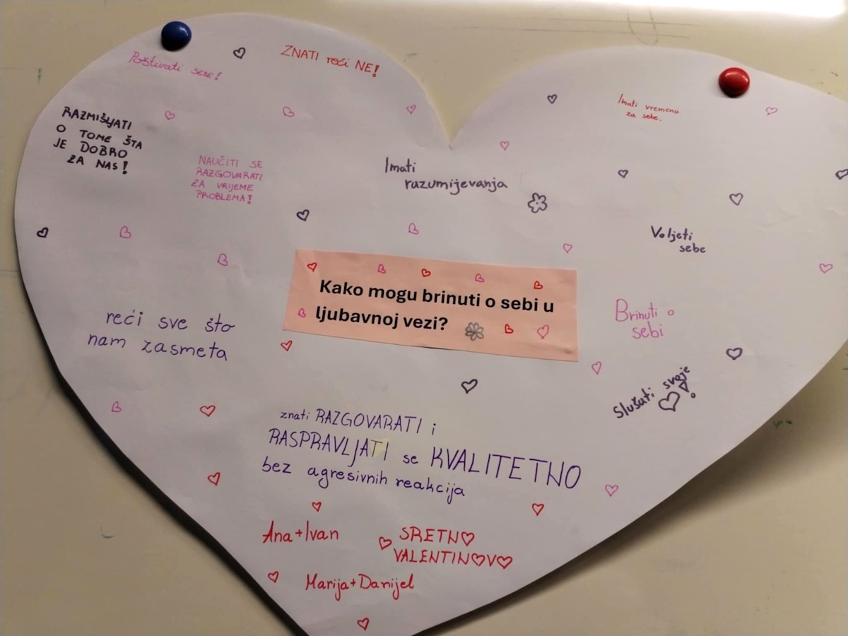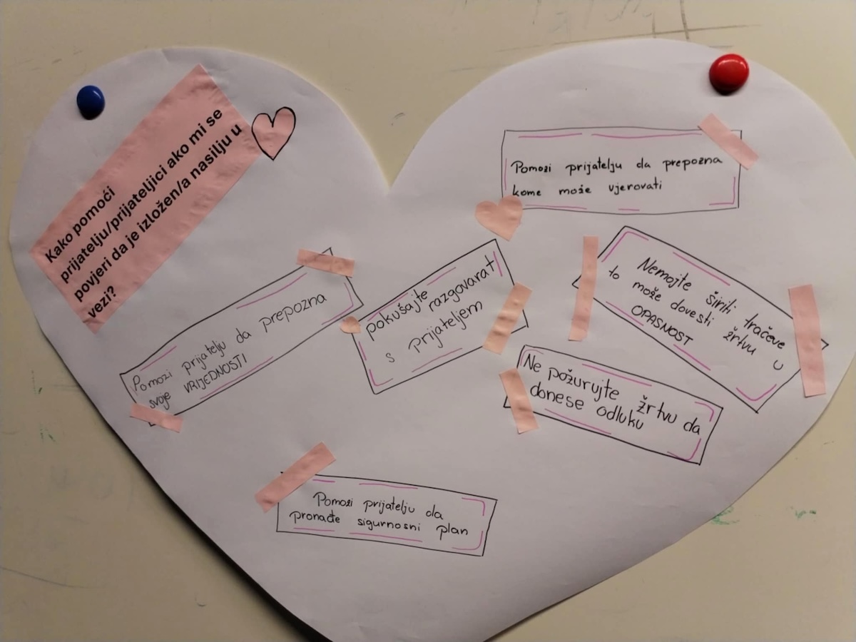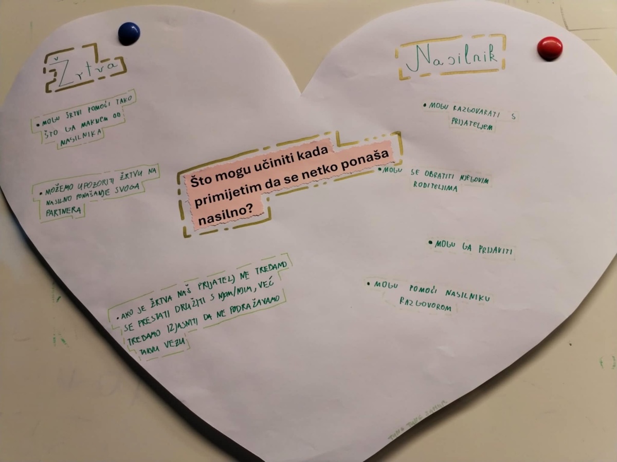 Rad se temeljio na interaktivnim metodama – grupnim raspravama, analizama situacija, radnim listićima i aktivnostima tijekom kojih su učenici osmišljavali savjete za različite situacije nasilja u ljubavnim vezama.