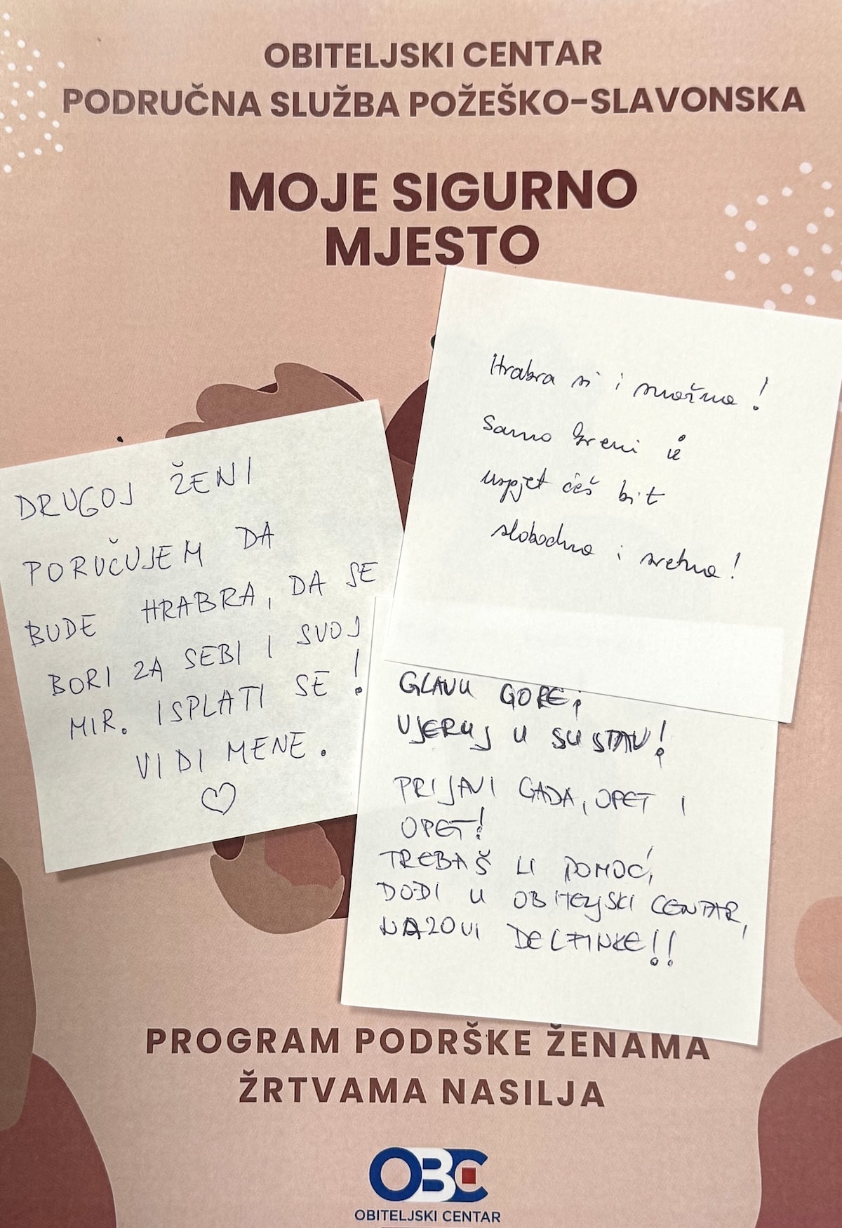 „Moje sigurno mjesto“ naziv je programa podrške ženama žrtvama nasilja koji je proveden u Područnoj službi Požeško-slavonskoj tijekom studenog i prosinca 2025. godine. U programu je sudjelovalo pet žena koje su kroz osam tjednih radionica dijelile svoja iskustva, međusobno se podržavale i ohrabrivale te kroz vođene aktivnosti učile kako prepoznati nasilje, kako se zaštiti te kako zatražiti i dobiti potrebnu pomoć i podršku. Kroz grupni rad polaznice programa su u sigurnim uvjetima imale priliku podijeliti svoje osjećaje i potrebe što je uz međusobno uvažavanje i povjerenje bilo za njih iznimno važno i korisno. Na posljednjoj radionici imale su priliku razgovarati s predstavnicama Hrvatskog zavoda za socijalni rad, policije i organizacije civilnog društva kako bi se na najbolji mogući način predstavila dobra međuresorne suradnja, od iznimnog značaja za povjerenje u sustav pomoći i podrške kada se radi o slučajevima nasilja.