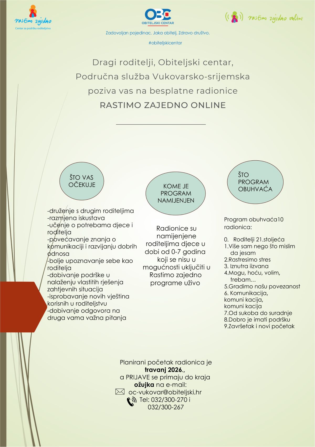 Obiteljski centar Područna služba Vukovarsko-srijemska u travnju započinje provedbu ciklusa radionica iz programa Rastimo zajedno ONLINE. Program je namijenjen roditeljima djece rane i predškolske dobi (od 0 do 7 godina) kojima treba podrška u okolnostima koje otežavaju roditeljstvo, a koji ne mogu sudjelovati u programima Rastimo zajedno uživo.